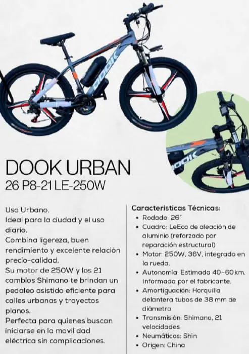 Rodado: 26" Cuadro: LeEco de aleación de aluminio (reforzado por reparación estructural) Motor: 250W, 36V, integrado en la rueda. Autonomía: Estimada 40-60 km. Informada por el fabricante. Amortiguación: Horquilla delantera tubos de 38 mm de diámetro Transmisión: Shimano, 21 velocidades Neumáticos: Shin Origen: China